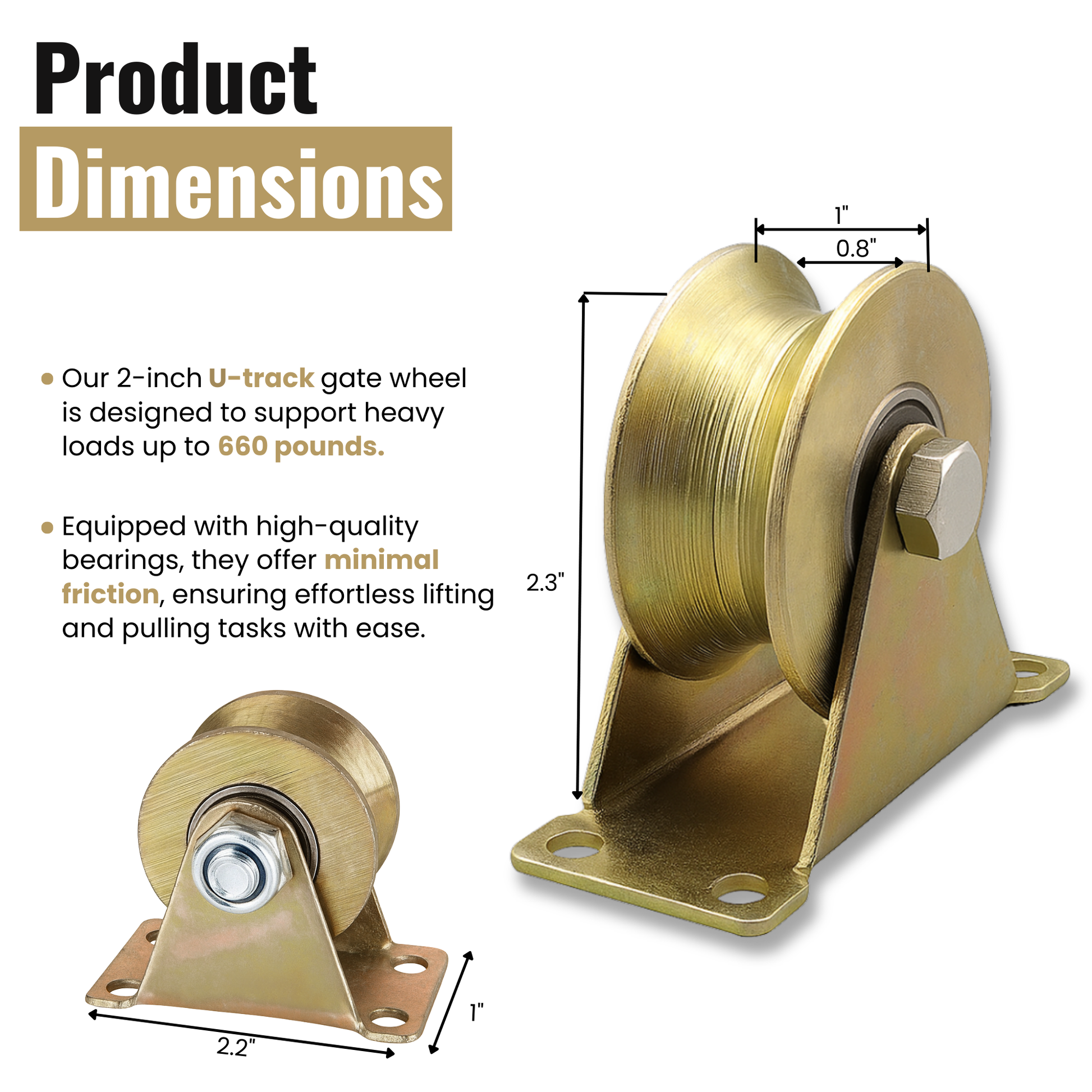 - VERSATILE STEEL U GROOVE PULLEY SPECIFICATION: Our Gold wheels are designed to fit 3/4 inch round tube orbits, featuring a 2-inch diameter main wheel, 1-inch groove width, and 2.36-inch caster height.
