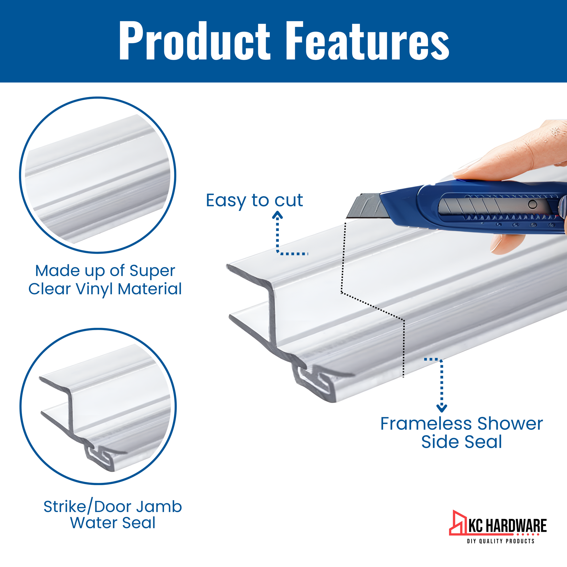 KC Hardware Strike/Door Jamb Water Seal- 95 inch Length (180 Degree) for 3/8 Inch Thick Glass, Water Guard That Prevents leaks, Ultra Clear